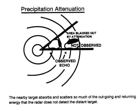 Reflected or attenuated by dense objects such as heavy clouds, precipitation,